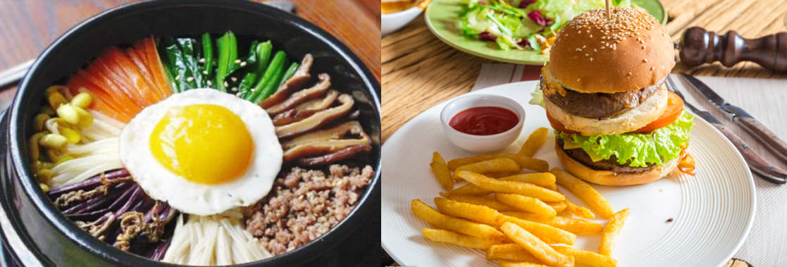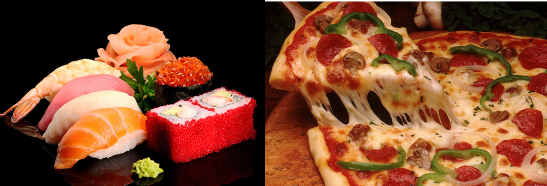 a. Sushi b. Bibimbap c. Hamburger and chips d. Pizza