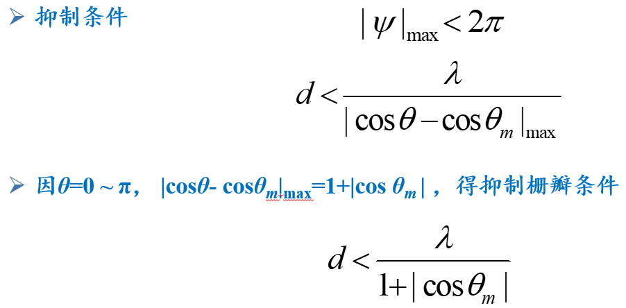 对于端射阵,θm=0,π,抑制栅瓣的条件为d <λ/2。
