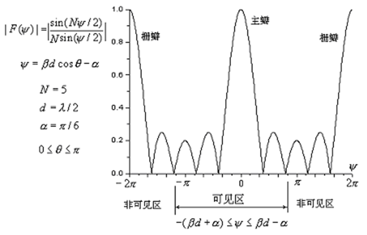 例:单元数为N=5,单元间距为d=λ/2,均匀递变相位为α=π/6时的归一化阵因子F(ψ)随ψ变化的图形: