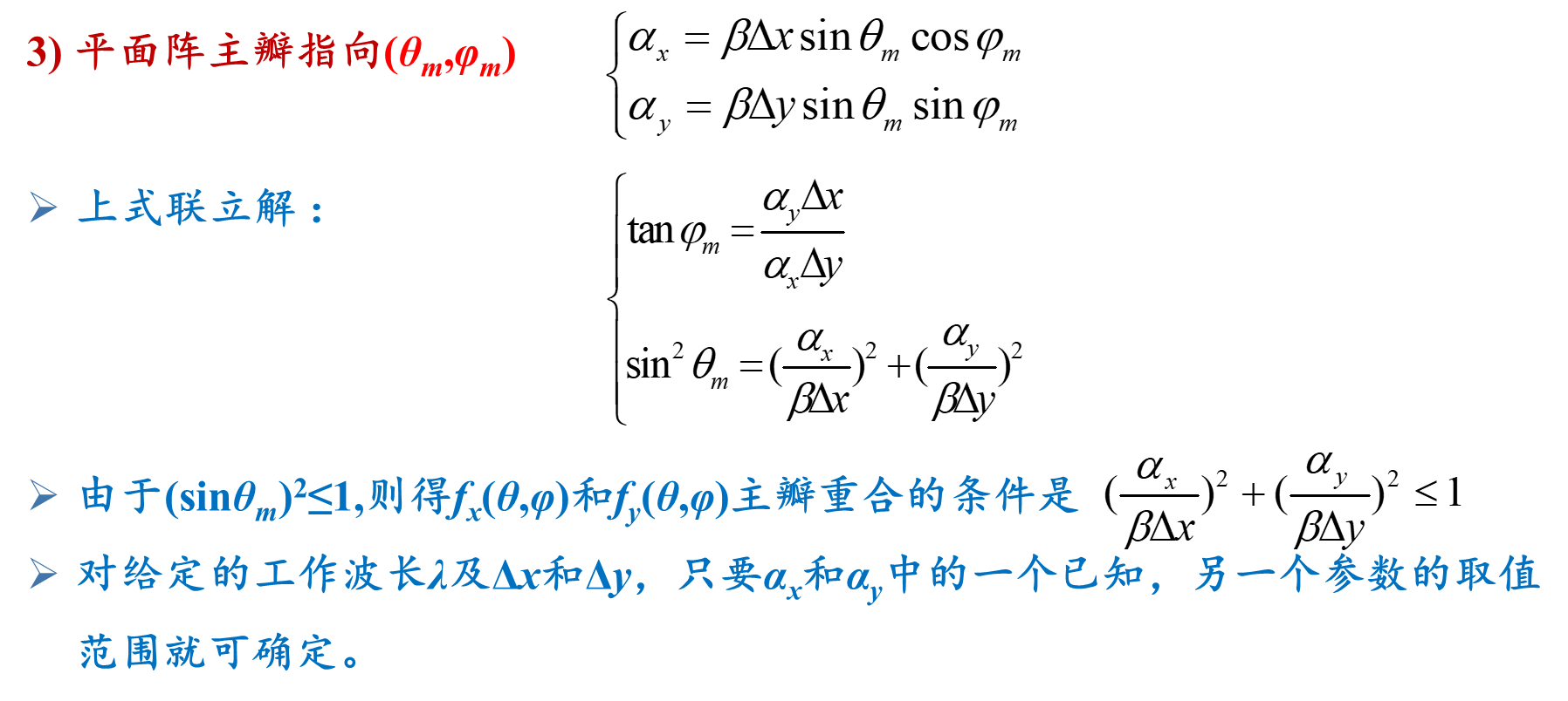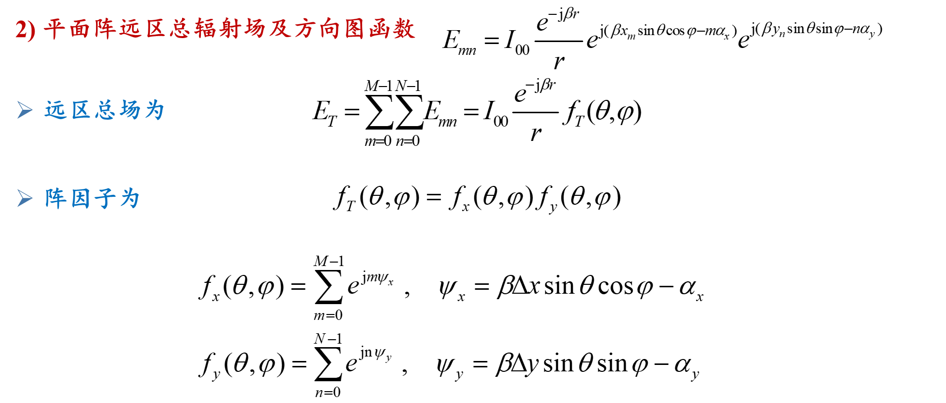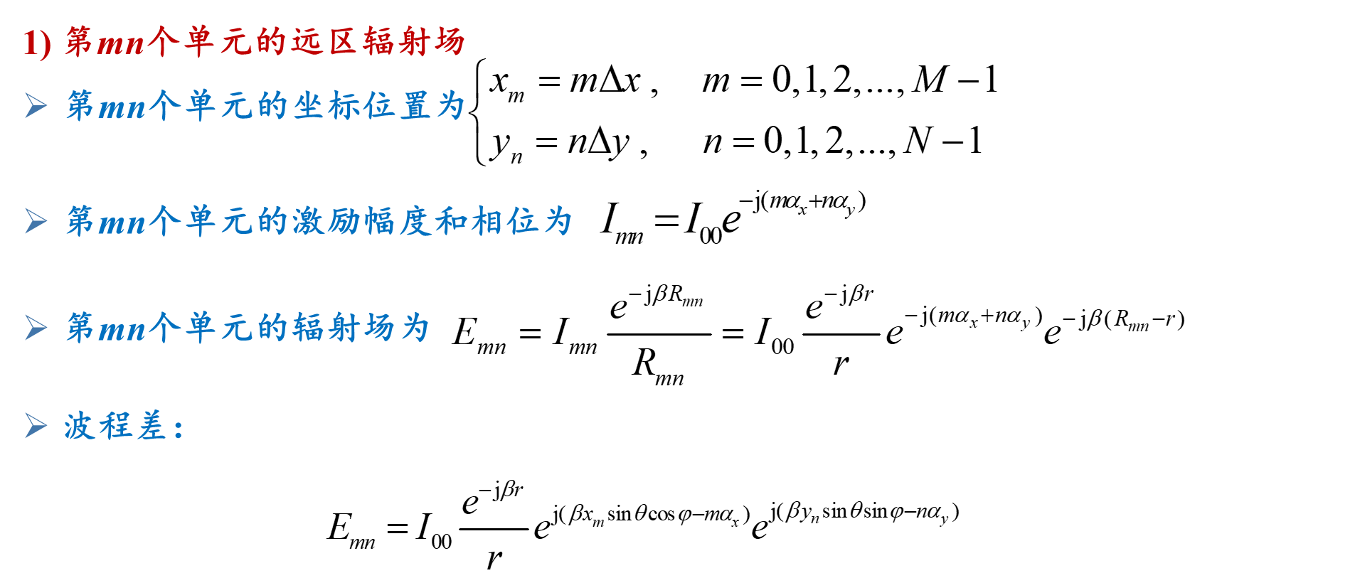 阵列中各天线单元类型相同,尺寸相同,馈电幅度相等,相位按行和列为均匀递变αx、αy,天线单元间距分别为Δx和Δy,单元数分别为M和N。