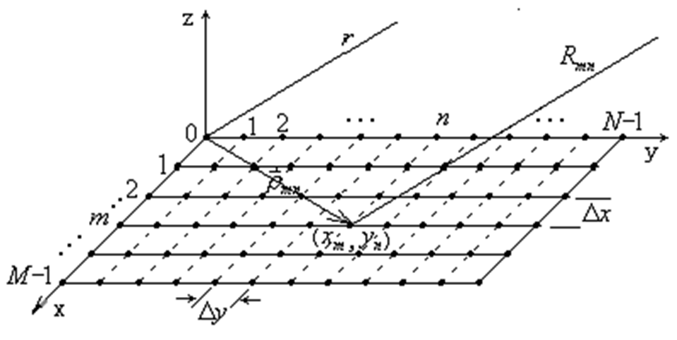 定义:平面天线阵是指天线单元按行、列等间距排列在一个平面内。若阵列的边界是一个圆,则为圆形平面阵;若边界是一个矩形,则为矩形平面阵等。平面阵有多种网格(栅格)形式:矩形网格、三角形网格等。这里主要讨论矩形网格矩形边界的平面阵,如图所示。