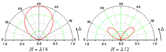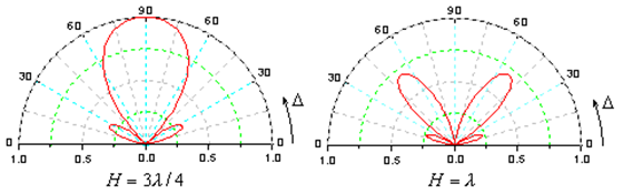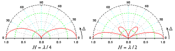 (2)当H≤λ/4时,H面内的方向图在Δ=60º~90º范围内变化不大,最大值在Δ=90º方向上,这种架设不高的水平半波天线,可用在300公里内的天波通讯中。