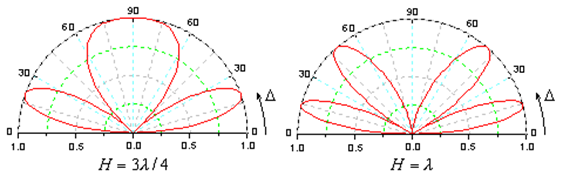 (3)在H面内的方向图仅与架高H有关,与天线长度无关。当H>0.3λ时,最大辐射方向不止一个(波瓣分裂),H/λ愈大,波瓣越多,靠近地面的第一波瓣的仰角愈小。当天线工作在这一模式上时,可根据通信仰角Δ选择架设高度H。