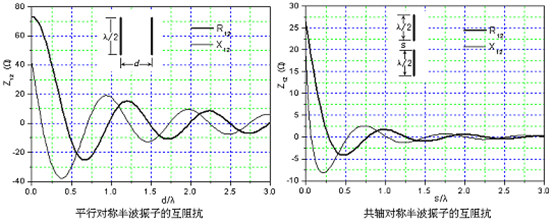 由于近地水平和垂直半波振子可看作是平行和共轴排列的二元阵。这两种排列的半波振子二元阵的互阻抗随间距的变化曲线如图4-12所示。