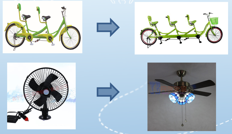同类组合是指若干相同或相近事物的组合,通过同一类型实物数量的增加来弥补功能上的不足或发挥新的作用。如:组合插座、双人和三人自行车、多头电风扇等