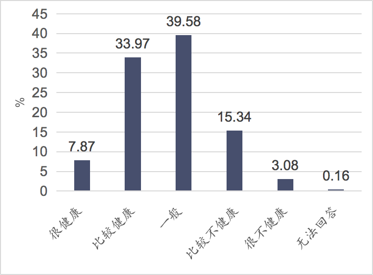 首先可以用一个中国人民大学老年学研究所在过去四年里进行的对11400多位老人的调查,来细化目前农村养老方面的需求。从2018年的数据可以看出,老年人评价自己的健康状况时,近80%以上认为自己健康或者比较健康或者一般健康;15.3%认为比较不健康;3%认为很不健康。这与老年人实际健康状况大体一致:失能老人占3%;身体不太健康但没有失能,需要一定支持的,大约占15%。