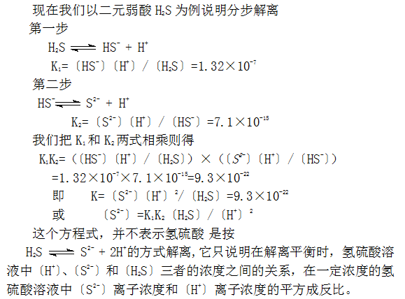 以上我们讨论的醋酸的解离,醋酸是属于一元弱酸,那么多元弱酸是怎样进行解离的呢?实验证明多元弱酸的解离是分步进行的,多元弱酸中的氢离子是依次一个一个的解离成氢离子的,但是决定溶液中H+浓度的主要是第一步解离;决定酸根离子浓度的主要是最后一步解离。