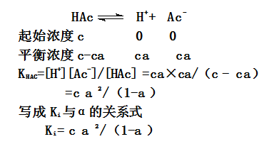 现以HAC弱酸为例来说明解离度α与Ki解离平衡常数的关系,设醋酸的原始浓度为cmol.L-1解离度为α