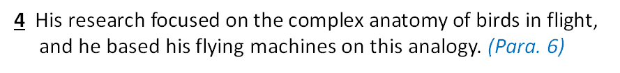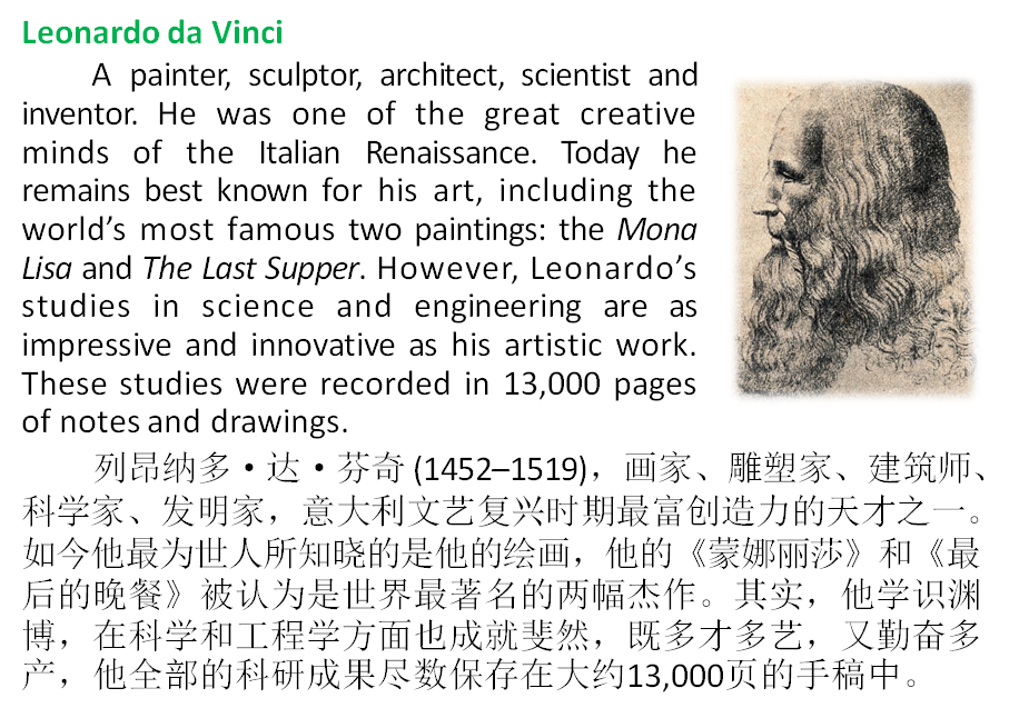 6 Centuries before Hughes was designing the Spruce Goose, another pioneer in transportation design was sketching plans for different kinds of flying machines. Leonardo da Vinci,perhaps the most famous artist of the Renaissance period, planned flying devices with flapping wings controlled and steered by human pilots. His research focused on the complex anatomy of birds in flight, and he based his flying machines on this analogy. It took almost 500 years for da Vinci’s sketches to become real. In June 2000, a professional parachutist named Adrian Nicholas jumped out of a hot-air balloon over the South African countryside using aparachute made of wood and canvas based on one of da Vinci’s designs. Nicholas landed safely, and Leonardo’s dream became reality.