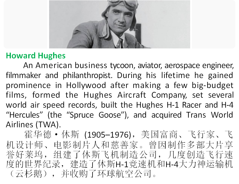 5 The Spruce Goosewas the biggest airplane ever built and still holds the record for the greatest wingspan, and it was made entirely of wood. Though it had promise, in the endthe project failed for three main reasons: the cost of building the enormous machine; the complexity of working with wood; and Hughes’s perfectionist approach, which caused the entire project to finish behind schedule. The Goose was put into storage and remained hidden from view until 1976, when it was put on display for the public. In 1992, the plane was dismantled and transported tothe state of Oregon, where it remains today. Many of the design features of the Spruce Goose have been incorporated into modern cargo planes. Like other pioneers in the field of transportation, Hughes was simply ahead of his time.
