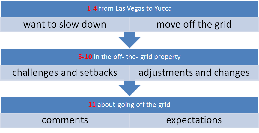 7 Our off-the-grid system consists of eight solar panels (1,000 watts) that are mounted on a sun tracker rack. We also have a wind turbine that generates 3,000 watts in 24 mph winds. The energy generated by the wind and sun is stored in 16 6v golf cart batteries.We also have two 2,500-gallon above-ground water tanks and a 250-gallon propane tank. Every weekend, we haul two 275-gallon water tanks to the nearby town of Yucca and fill them with water, which we then pump into our big water tanks.