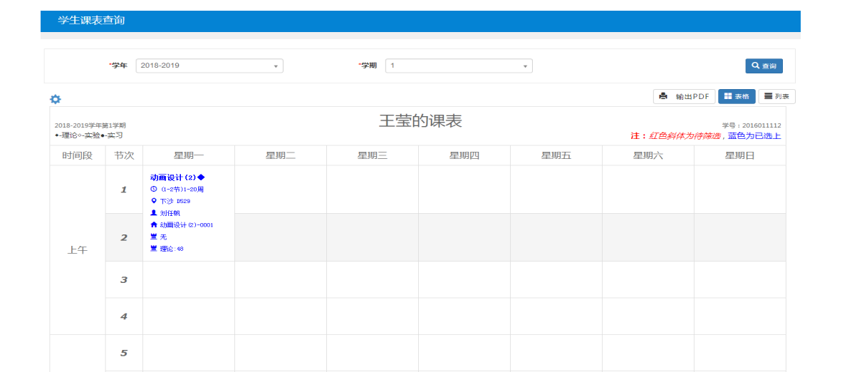 学生课表中的红色课程表示待筛选的课程,蓝色课程表示已筛选上的课程。