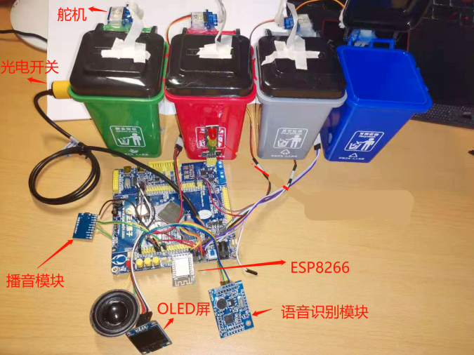 串口通讯反馈垃圾种类给 STM32 主控芯片驱动舵机翻开垃圾桶盖,可通过串口通讯驱动播音模块播报垃圾种类名, 可通过 IIC 通讯驱动 OLED 屏显示垃圾种类名。垃圾桶内设置有光电开关用于检测桶内容量,并将垃圾容量信息通过 ESP8266 WIFI 模块采用MQTT 协议上报到阿里云物联网平台,微信小程序可从阿里云平台订阅、展示垃圾桶余量信息。设计实现了智能垃圾分类、非接触式智能开闭、桶内容量检测与提醒等功能。
