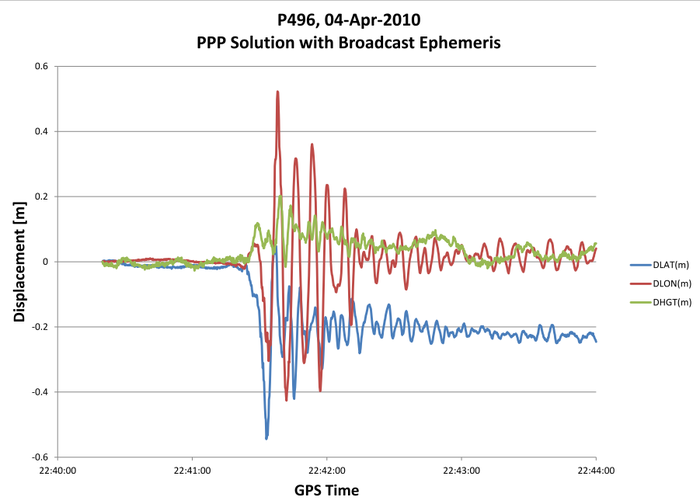 In order to demonstrate how PPP can provide similar results as VADASE, I processed data from station P496 during the 2010 earthquake in California (this data set was also used in the Colosimo et al. paper). The figure below shows the PPP-derived displacements using only 3 minutes and 40 seconds of data and broadcast satellite orbit and clock corrections. In this case, the solution is smoothed to eliminate the convergence period. As you can see, the results are very close to the VADASE solution (refer to above paper, Fig. 8), but no trends were removed from the PPP solution.