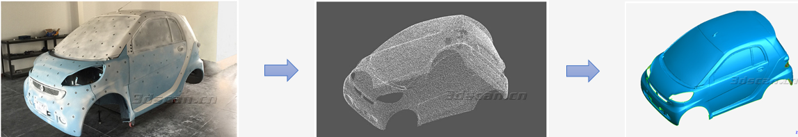 逆向工程师首先根据客户要求,使用手持式三维激光扫描仪扫描汽车整车,并将扫描仪数据输出至GeomagicStudio进行点云预处理,再将点云导入UGNX软件进行模型逆向重构,最后再由产品设计师在逆向模型基础上进行外观的创新型改进设计。