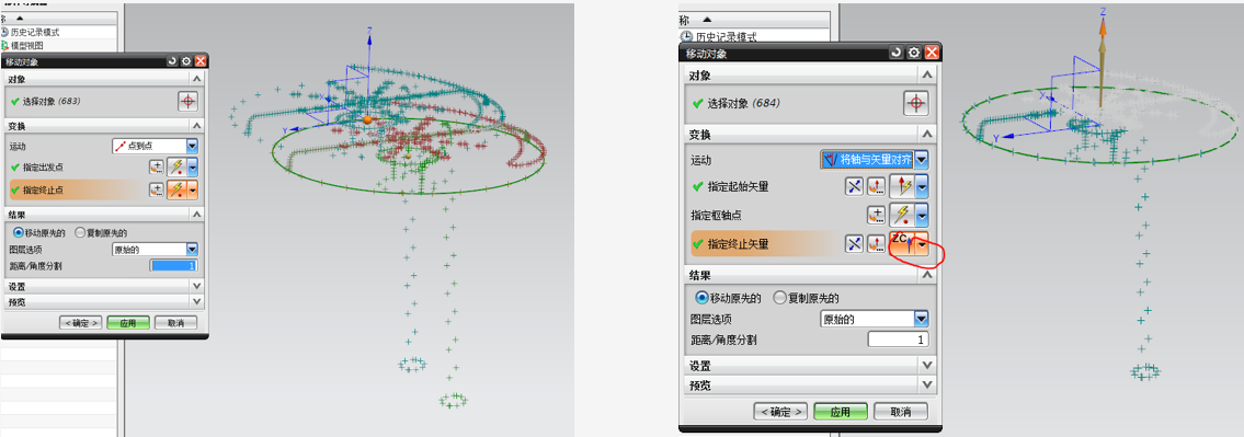 ③ 使用“移动对象”命令,将“凳子”点云以凳面圆心和坐标原点重合的方式,进行移动。并使圆心连线和Z轴对齐。