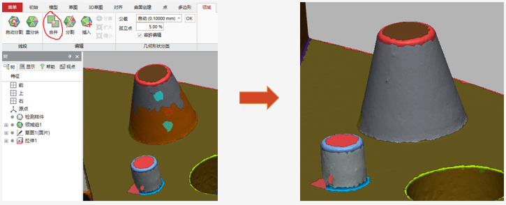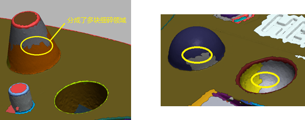 自动划分领域是系统根据对区域曲率的计算,自动进行特征类型的判断和分类。它具有一定的不可控性。有的时候,明明是一张面,可能被分成了好几个独立的领域。比如下图中的圆台侧面,它被分成了2个“圆锥”领域。还有,球体凸台、半球体的凹槽,都是一样的情况。这时候,我们就需要手动对领域进行进一步的编辑了。