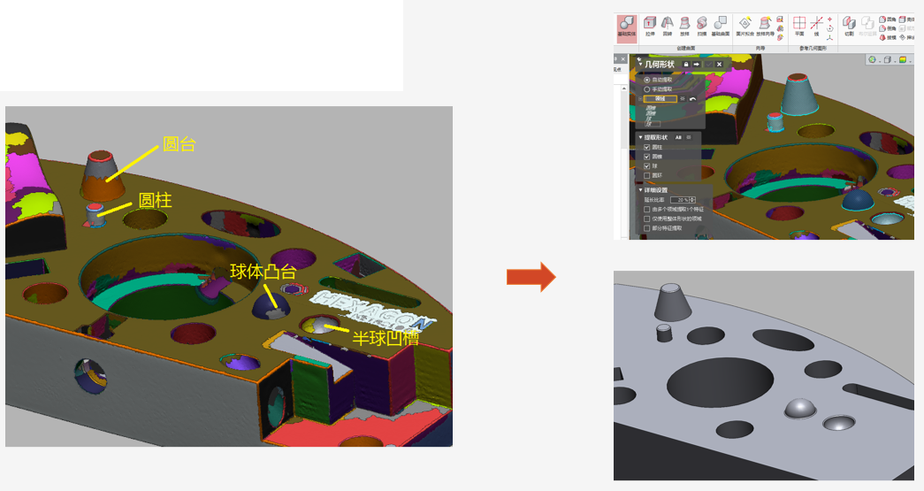 基体主体上,有1个圆柱、1个圆台、1个球体凸台和1个半球凹槽四个特征。Design X中,像这样的规则几何实体,可以使用“基础实体”命令,直接提取出来。再通过布尔运算,实现和主体的合并。
