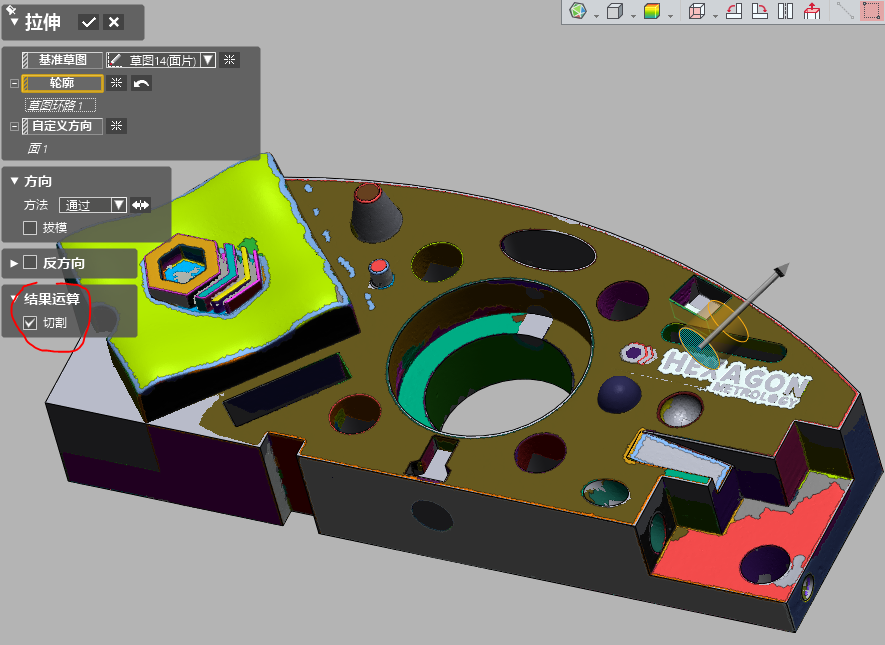 ① 以基体前侧面为草绘面,提取通孔端面轮廓。