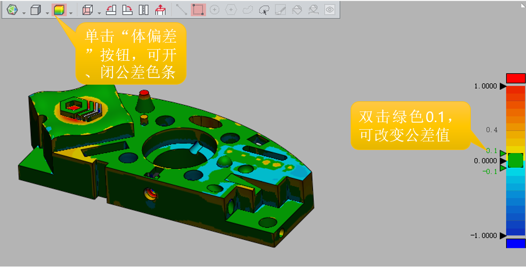 单击操作界面上方的体偏差按钮,可以打开或者关闭模型上的色差图谱显示效果。界面右侧有一个常驻的公差颜色条。双击最内部的绿色数值,可以修改允许偏差的上、下边界值。