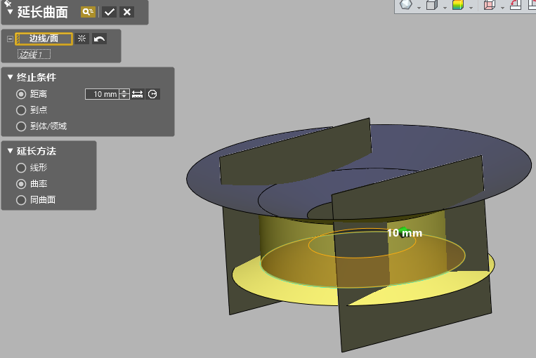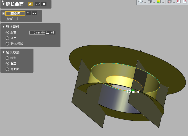 ③ 使用延长曲面,将轮轴上部、下部曲面进行延长。