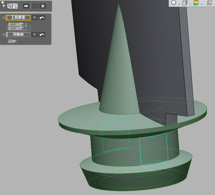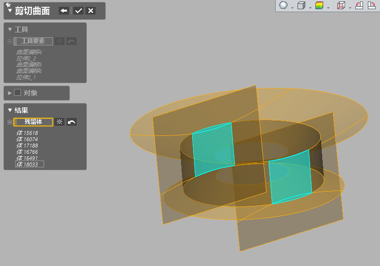 ④ 使用剪切曲面,将曲面相互剪切出切口曲面。