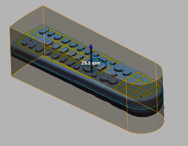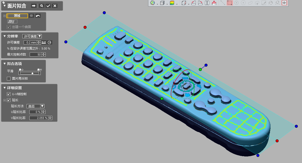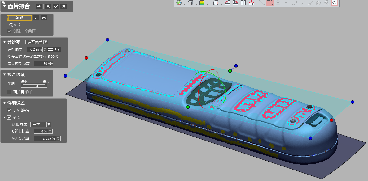 主体特征由顶面、背面和侧面3部分组成。其中,侧面为直纹面,可以通过获取轮廓截面草图,并进行拉伸得到。顶面和背面则是2张不规则的曲面,需要手动进行领域的提取后,通过“面片拟合”命令创建。