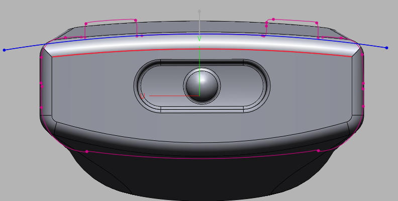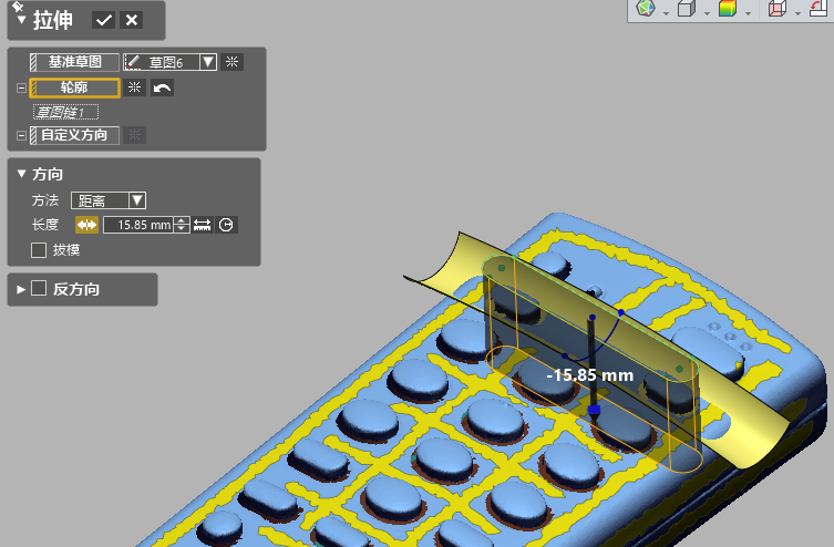 这里我们需要转换一下思路。可以先通过扫描,获取小凹槽的底部轮廓。接着画出端面草图,进行拉伸。将拉伸面和扫描面求交,得到一个曲面组。最后,用这个曲面组去修剪遥控器主体,即可得到小凹槽特征。
