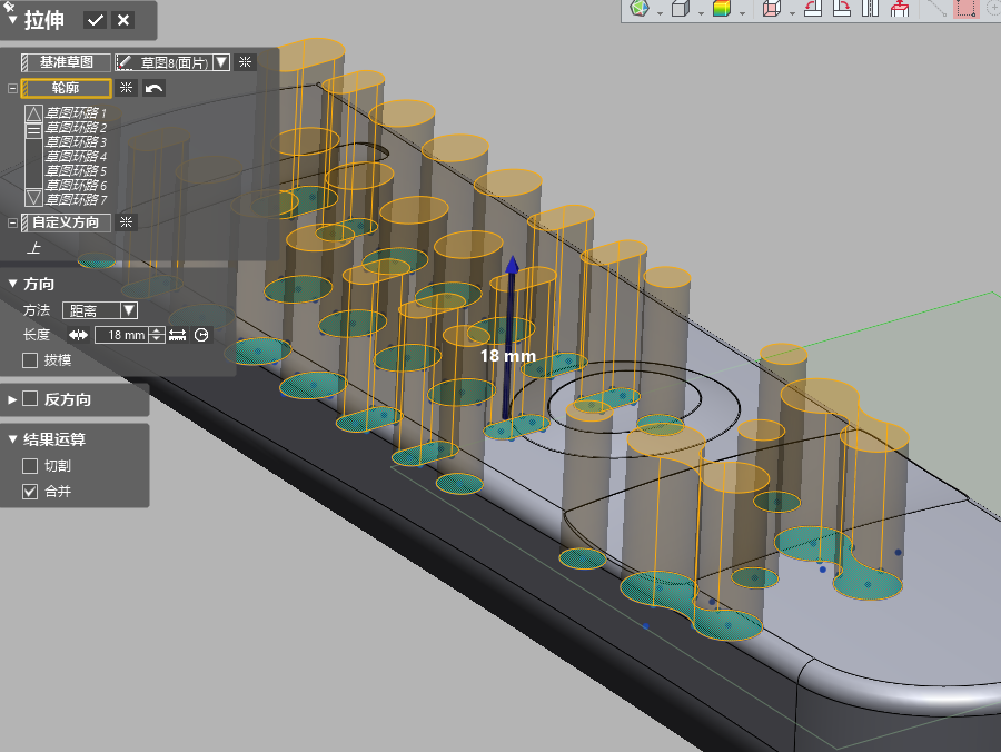 ④ 再次使用拉伸创建突起区域的按钮特征,这里不要点‘合并’。