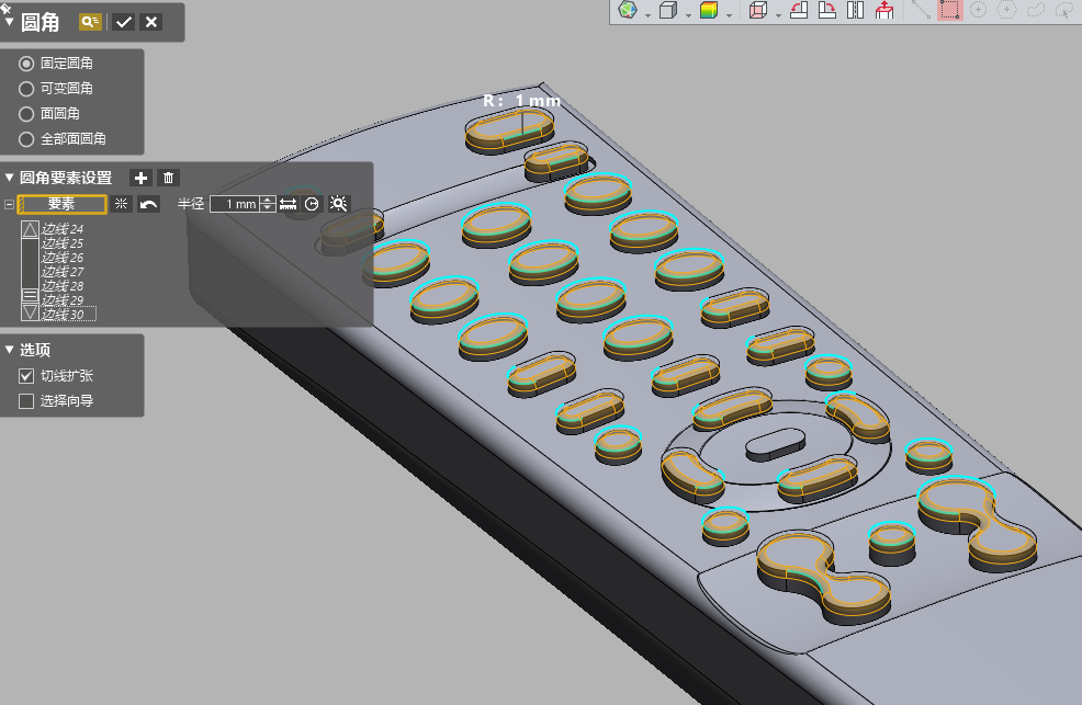 ③ 使用合并拉伸出按钮特征,高度以超过遥控器顶面即可。