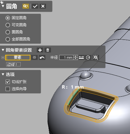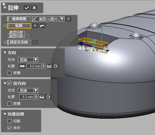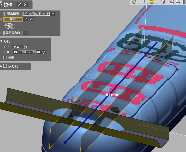 ④ 以卡扣两侧边界线为截面,创建拉伸曲面。