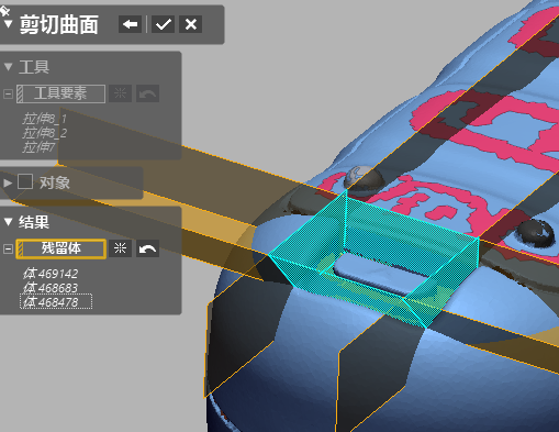 ⑤ 两组拉伸面相互修剪、合并,得到卡扣边界轮廓曲面。