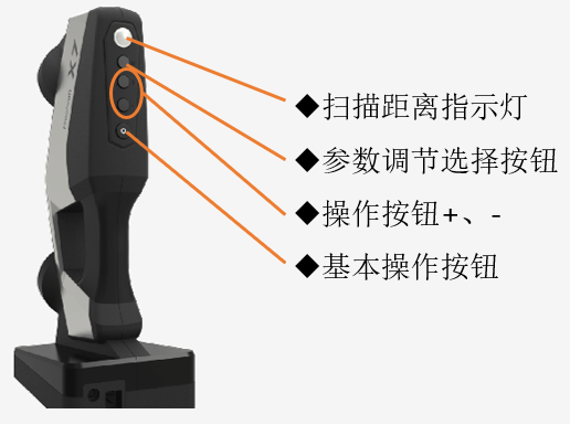 手柄后侧是控制按钮。由下至上分别是扫描距离指示灯;参数调节选择按钮,也就是Menu键;操作按钮+键、操作按钮-键和基本操作按钮。