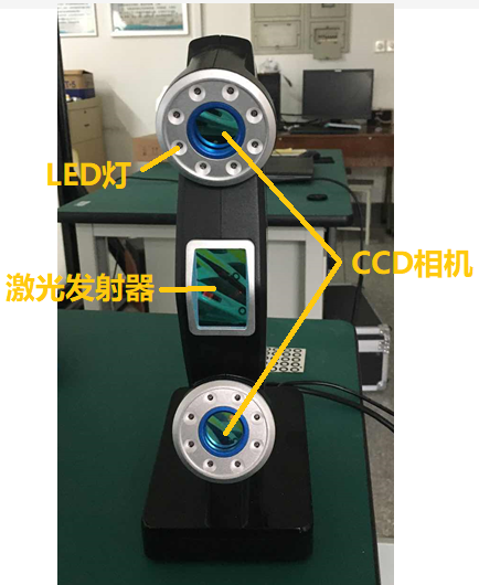 X7类似一个操作手柄。正面由上、下2个CCD相机,中间的激光发射器,和相机外的LED灯3部分组成。