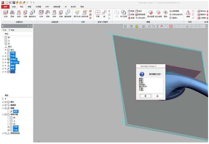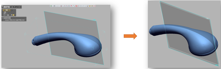 ② 使用基准平面中的镜像方法,以平面1和花洒点云为要素,生成平面2,即中心对称面。