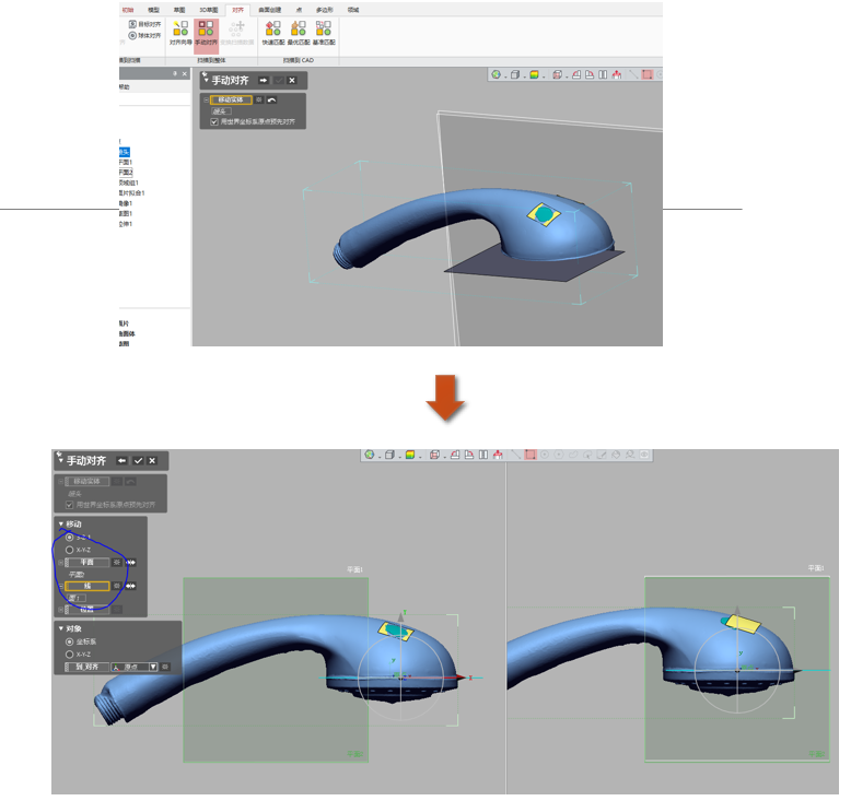 花洒点云没有用来指导对齐的要素特征,可以根据外观的特点,为其创建中心对称面和水平基准面。