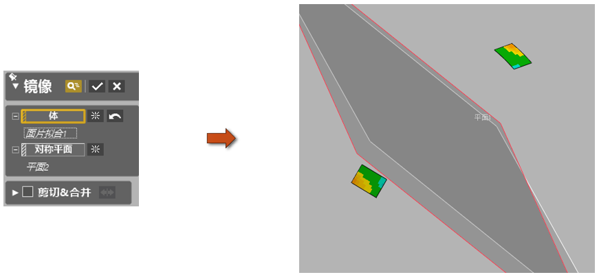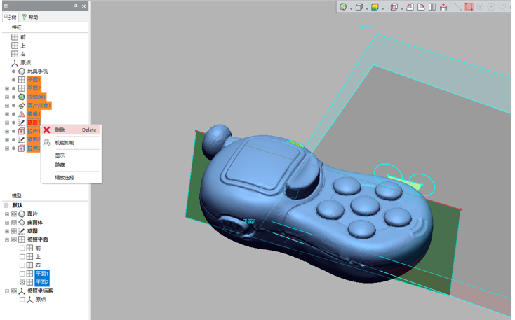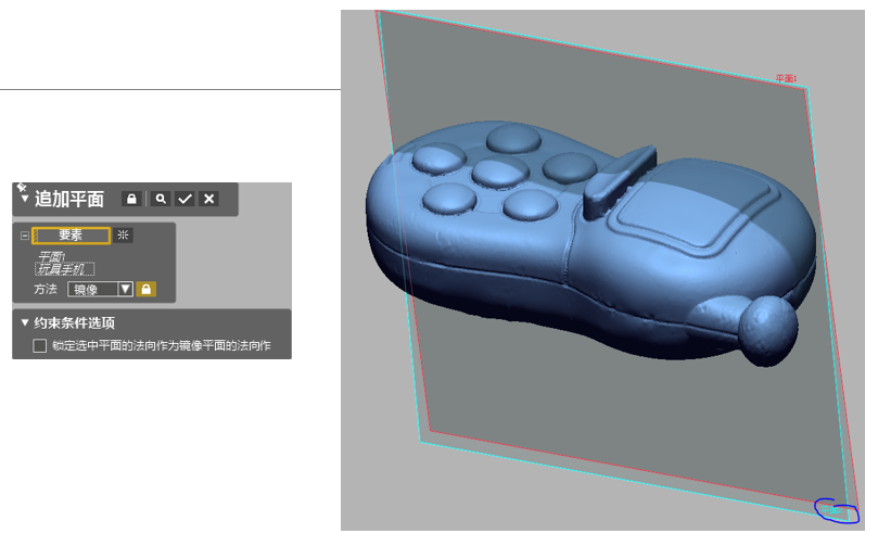 ② 使用基准平面中的镜像方法,以平面1和玩具手机点云为要素,生成平面2,该面即可认为是玩具手机点云的中分面。