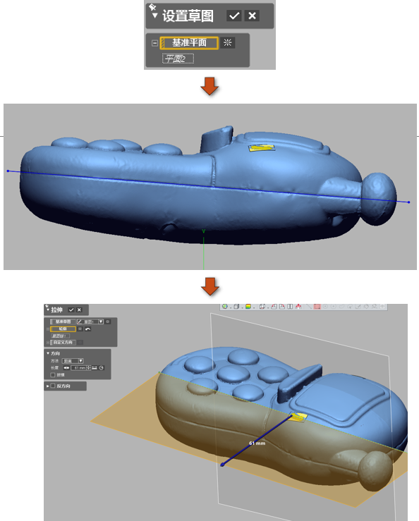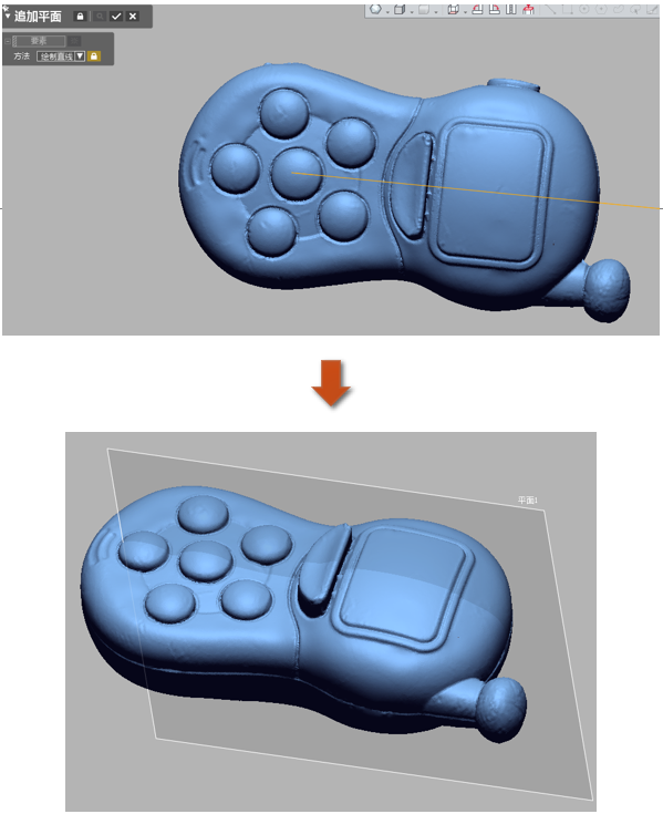 ① 使用基准平面中的绘制直线方法,在空间中绘制一条玩具手机点云的平分线,生成平面1。