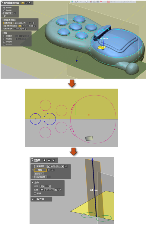 c) 以拉伸面为基准平面,在截取按钮轮廓的位置创建面片草图。