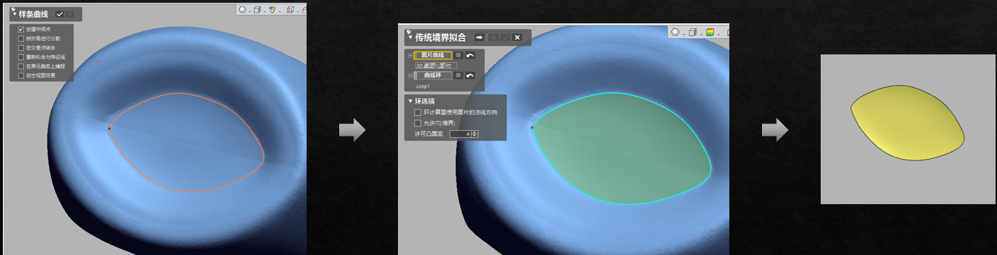 ±传统境界拟合——封闭的3D面片样条区域内创建曲面。