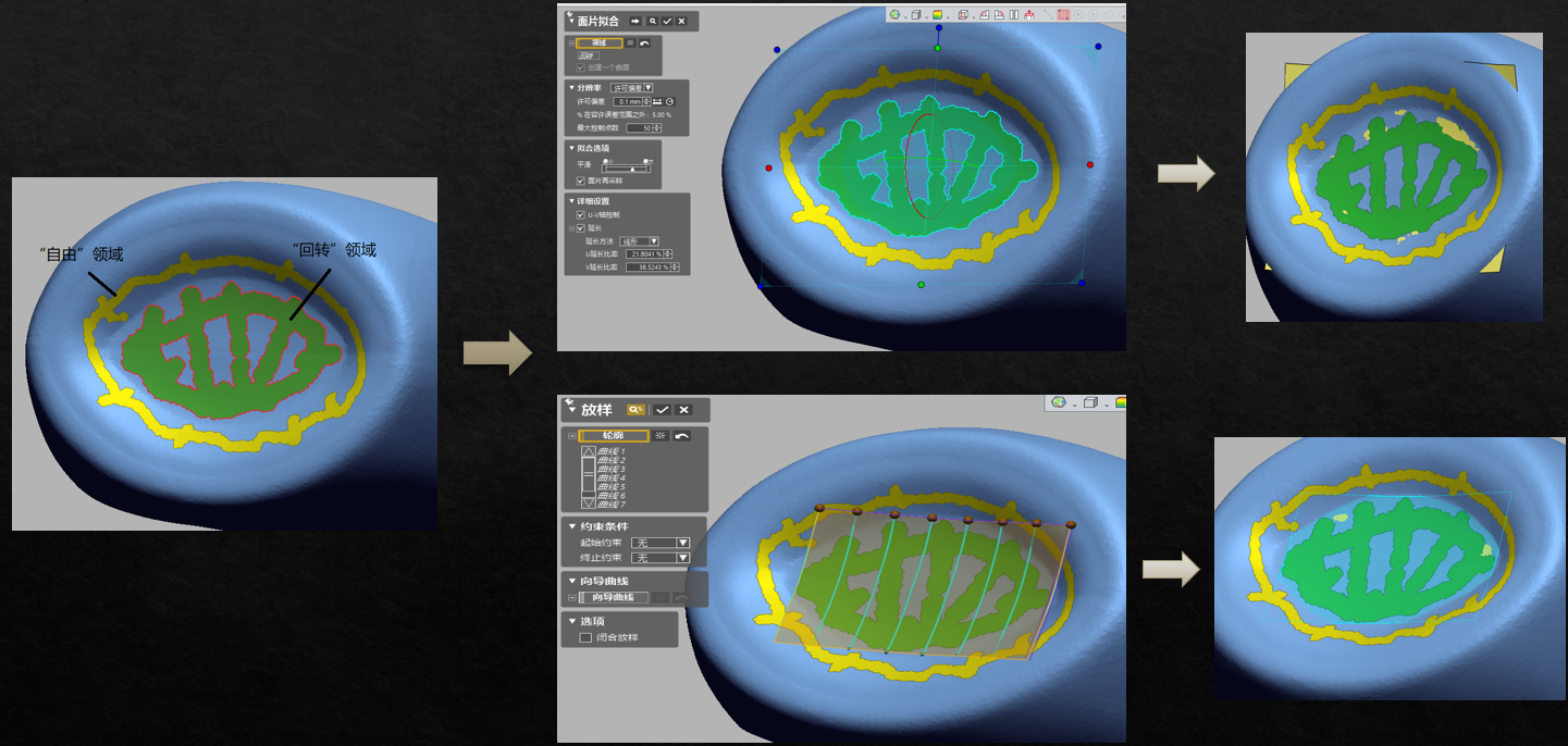±面片拟合、放样向导——基于自由回转领域创建曲面。