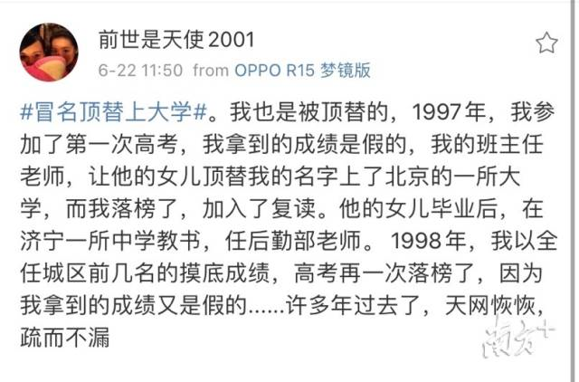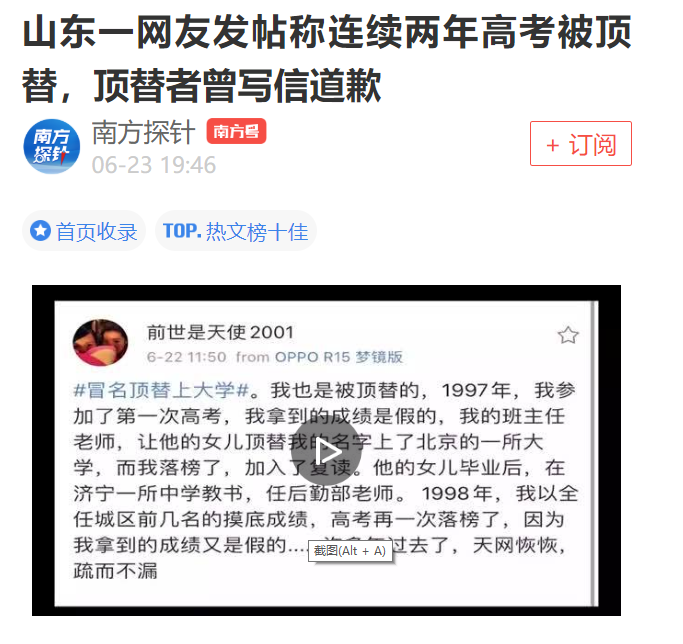 1、媒体报道一:0623《南方日报》 的“南方探针”最早报道《山东一网友发帖称连续两年高考被顶替,顶替者曾写信道歉》