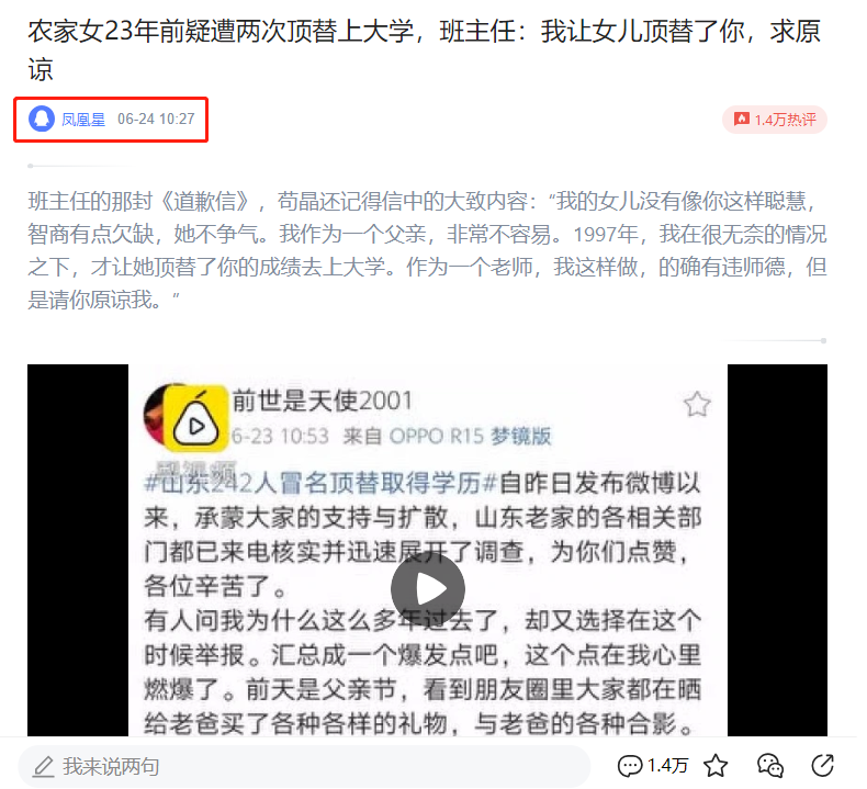2、媒体报道二:0624 《凤凰周刊》官方企鹅号“凤凰星”随即跟进报道《农家女23年前疑遭两次顶替上大学,班主任:我让女儿顶替了你,求原谅》