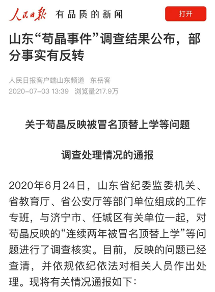 3、媒体报道三:0703《人民日报》公布最后的调查结果《山东“苟晶事件”调查结果公布,部分事实有反转》舆论导向翻转,网友集体抨击苟晶谎话连篇