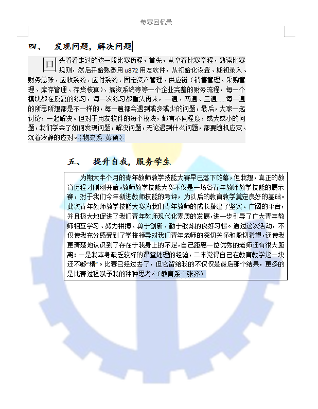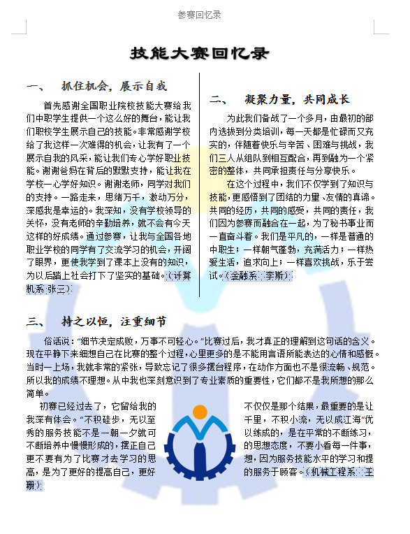 为了让大家更了解职业技能大赛,我们请了五位往届选手来分享他们的参赛感想,需要你来把这些感想刊登到专题特刊上。