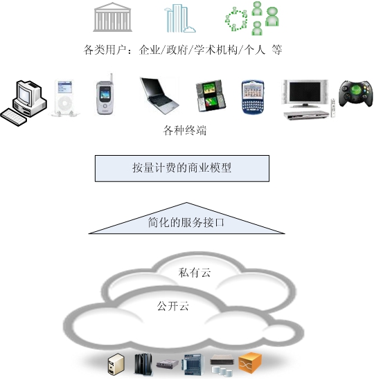 提供资源的网络被称为“云”。“云”中的资源在使用者看来是可以无限扩展的,并且可以随时获取,按需使用,随时扩展,按使用付费。这种特性经常被称为像水电一样使用的IT基础设施。