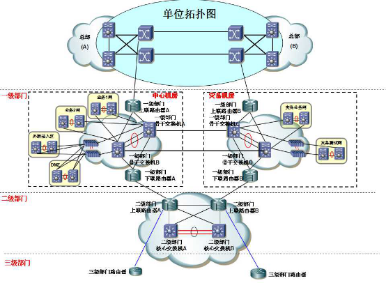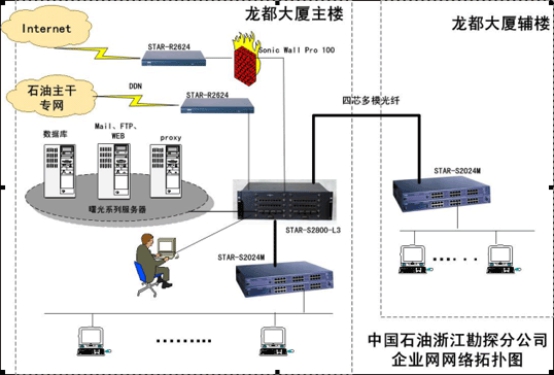 ① 网络建设部分:以网络中心形成企业主干网总节点,对外连接广域网和石油主干专网,对内实现与辅楼分中心的连接。广域网连接采用网通100M宽带接入,由实达路由器完成内外地址转换,实现外网访问,并通过硬体防火墙实现对内网的安全保护;石油主干专网连接采用DDN专线接入;整个网络实现全网管千兆互联,并根据需要对网络作了适当的VLAN划分