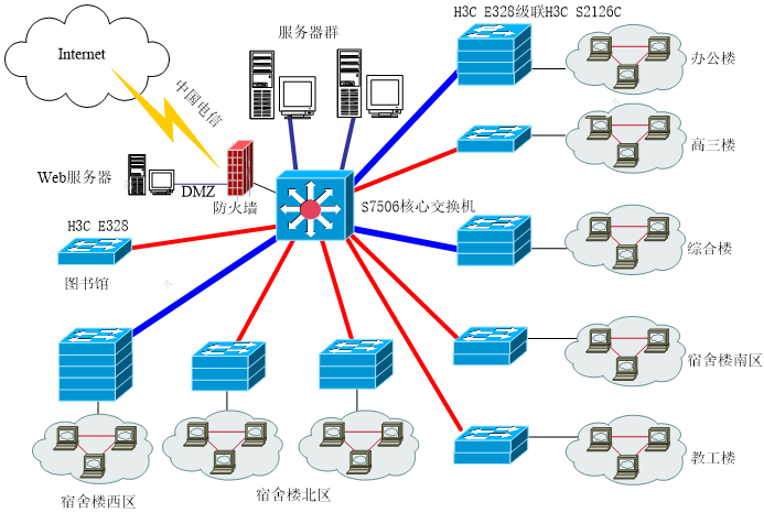 根据该中学信息点的分布及数量情况,考虑到核心交换机需要为内网的各项信息化应用提供一个高速、优质的数据通信和图像传输平台,满足数据和视频传输的需要,考虑到目前的应用以及将来网络扩展的需要,特别选用了一台技术先进的、高性能的华为3COM S7506核心路由交换机来构造内部网络的中心节点。