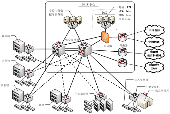 ⑤设置间子系统(图书馆2号机房):设备间是在每一幢大楼的适当地点设置进线设备,进行网络管理以及管理人员值班的场所。设备间子系统应由综合布线系统的建筑物进线设备、电话、数据、计算机等各种主机设备及其保安配线设备等组成。