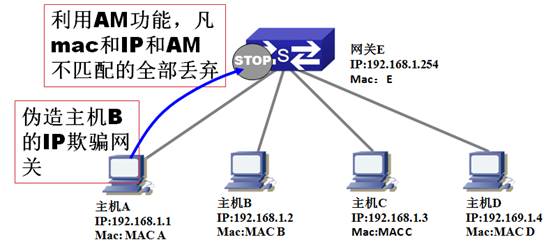 举例:在交换机接口4 上将源IP 为192.1.1.1 和源MAC是MAC A绑定。